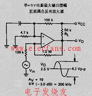 單5V電源電大輸出擺幅直流耦合反相放大器