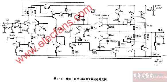 電子發(fā)燒友網(wǎng)>電子技術(shù)應(yīng)用>電路原理圖>放大電路圖>運算放大器電路>輸出100W功率放大器的電路圖