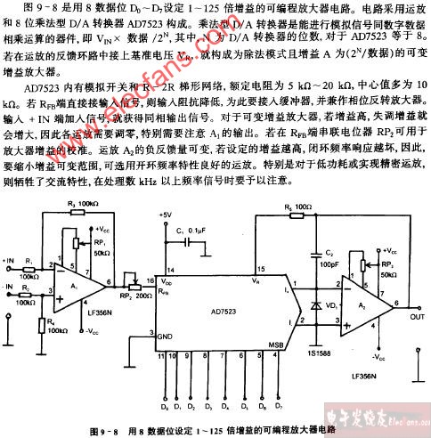 用8數(shù)據(jù)位設(shè)定1~125倍增益的可編程放大器電路圖