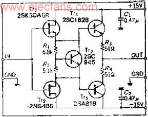 該電路圖的增益為1,電路中Q1和Q2構(gòu)成簡單的高速場效應(yīng)晶體管輸入緩沖放大器。Q1起源跟隨器的作用,Q2作電流源負(fù)載,以調(diào)定漏-源溝道電流。高速高輸入阻抗穩(wěn)定 緩沖放大器 電路: