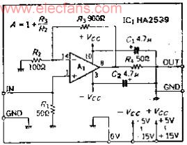 243 從無線接收機寬帶放大器模塊對射頻小信號進行低噪聲放大的實際性能需求出發(fā),在設計上選用了一種新型的寬帶運放芯片CLC425,充分利用了該器件的超低噪聲和高增益帶寬的特點,在