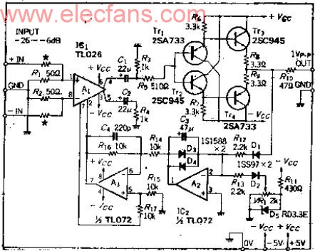 輸入電路中,帶有★標記的電阻是為降低輸入電平而加的,驅(qū)動50歐負載時,因為TL026難以獲得較大的輸出振幅,所以在電路中增加了由晶體管組成的推挽緩沖放大器,以減輕TL026的負擔。
