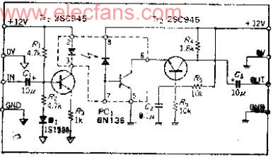 2 如圖所示為光電隔離放大器電路。在自動控制系統(tǒng)、數(shù)據(jù)采集系統(tǒng)、計算機I/O接口和通信設備中都可能使用光電隔離放大器。光電隔離放大器又稱為光電耦合器,這種器件是一種將發(fā)光元件與受光元件相對設置并封裝