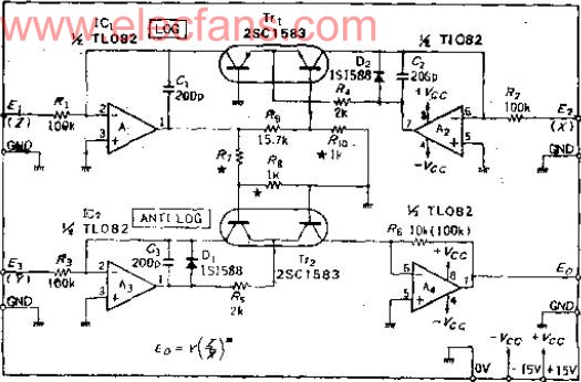 基本工作過程可參考對(duì)數(shù)、反對(duì)數(shù)電路;只是把OP放大器A2輸出的對(duì)數(shù)再輸入到反對(duì)數(shù)電路中、對(duì)數(shù)組件把E1(Z)和E2(X)之比轉(zhuǎn)換成對(duì)數(shù),此對(duì)數(shù)信號(hào)經(jīng)過R7后被輸入到反對(duì)數(shù)組件,可用下式表示其傳遞特性: