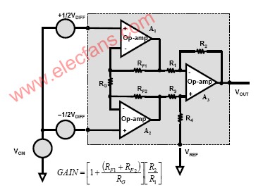 圖1:三運(yùn)放儀表放大器,其VCM為共模電壓,而VDIFF為相同儀表放大器的差動(dòng)輸入。