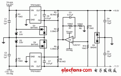 上圖所示電路使用一個如 TPS7A3001 等可調(diào)節(jié)、負輸出電壓 LDO 線性穩(wěn)壓器,以及如 TPS7A4901 等可調(diào)節(jié)、正輸出電壓 LDO。U3、R7-R10 和 C3 均為增加的組件,用于追蹤。R1、R2、D1-D5 均為增加組件,用于將反饋引腳的電壓控制在其各自產(chǎn)品說明書額定的絕對最大電壓范圍內(nèi)。