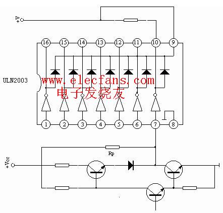 ULN2003應(yīng)用電路在自動(dòng)化密集的的場(chǎng)合會(huì)有很多被控元件如繼電器,微型電機(jī),風(fēng)機(jī),電磁閥,空調(diào),水處理等元件及設(shè)備,這些設(shè)備通常由CPU所集中控制,由于控制系統(tǒng)不能直接驅(qū)動(dòng)被控元件,這需要由功率電路來擴(kuò)展輸出電流以滿足被控元件的電流,電壓。