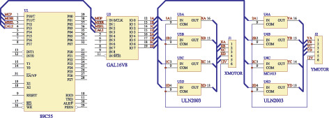 在實(shí)習(xí)運(yùn)用中通常驅(qū)動(dòng)路數(shù)不止一路,用上圖的分立電路體積大,許多場(chǎng)合用現(xiàn)成的集成電路作為多路驅(qū)動(dòng)。常用的小型步進(jìn)電機(jī)驅(qū)動(dòng)電路可以用ULN2003或ULN2803。本書配套試驗(yàn)板上用的是ULN2003。