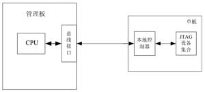 在一個獨立的機框中各單板中JTAG設(shè)備的邊界掃描以及更新可以由單板獨立完成,或由其他控制板通過某種類型總線傳送到該單板進行,從而可實現(xiàn)自更新/自測試或者遠程更新/遠程測試,如圖4所示。圖中管理板與單板之間的通信總線可以有多種選擇,但是根據(jù)ATCA的規(guī)范,管理板與節(jié)點板之間只有IPMB總線,而IPMB即為IIC總線,IIC總線的全速只有400Kb/s,在進行大量測試以及更新數(shù)據(jù)傳送時這種速錄一定會成為瓶頸。此為JTAG技術(shù)在ATCA中應(yīng)用的一個不利因素。