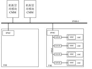在ATCA架構(gòu)的系統(tǒng)中,每個機框配備兩塊CMM(Chassis Management Module,機框管理模塊),互為主備,如圖1所示,每個CMM可單獨管理機框內(nèi)的所有單板,同時每個單板中都需要實現(xiàn)IPMC(Intelligent Platform Management Controller,智能平臺管理控制器)的功能,IPMC主要完成ATCA單板或其他機框組件上各種關(guān)鍵硬件資源的監(jiān)視、控制及管理,包括單板或模塊的有效凈荷部分狀態(tài)檢測、單板溫度及電壓檢測、熱插拔管理、FRU信息獲取、告警管理、電源管理、復(fù)位狀態(tài)、傳感器及事件管理、日志管理、E-Keying(電子開關(guān))管理等,同時要完成對AMC(Advanced Mezzanine Card,高級夾層子卡)子卡硬件地址、溫度、電壓、復(fù)位、熱插拔和告警指示燈等的管理及事件記錄,通過雙冗余的IPMB(Intelligent Platform Management Bus,智能平臺管理總線)總線與CMM通信,把各種事件及信息上報給CMM并接受CMM的管理和控制。