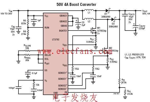 10LT3782演示電路-兩相升壓DCDC轉(zhuǎn)換器(10-14V至24V@2.0A)