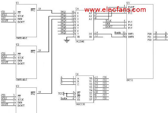 通過使用74HC245、74HC138以及AT89S52設(shè)計了一種用于多路開關(guān)狀態(tài)檢測的系統(tǒng),74HC245有一個低有效的OE使能端,同時74HC138的輸出也是低有效的,這樣一個74HC138的輸出就能控制8個74HC245的OE端