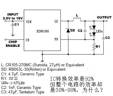 其實(shí)每款DC/DC的IC(無(wú)論升壓或降壓)都能接成恒流的LED的驅(qū)動(dòng),現(xiàn)在分別以KZW3688和CE9908為例介紹一下接法及特點(diǎn)。