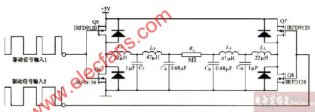 小。因輸出功率稍大于1W,屬小功率輸出,可選用功率相對較小、輸入電容較小、容易快速驅(qū)動的對管,IRFD120和IRFD9120 VMOS對管的參數(shù)能夠滿足上述要求,故采用之。實(shí)際電路如圖14所示?;パa(bǔ)PWM開關(guān)驅(qū)動信號交替開啟Q5和Q8或Q6和Q7,分別經(jīng)兩個(gè)4階Butterworth濾波器濾波后推動喇叭工作。
