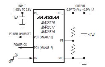 MAX8516, MAX8517, MAX8518 1.425V至3.6V輸入、1A、0.2V壓差的LDO穩(wěn)壓器