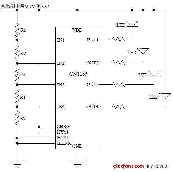 CN1185是一款低功耗四通道電壓監(jiān)測芯片,其消耗的電流只有7.3微安,非常適合監(jiān)測電池電壓。芯片內(nèi)部包含四個電壓比較器,每個比較器的正輸入端接到芯片內(nèi)部的電壓基準(zhǔn)源,可以用來監(jiān)測4 個不同的電壓源