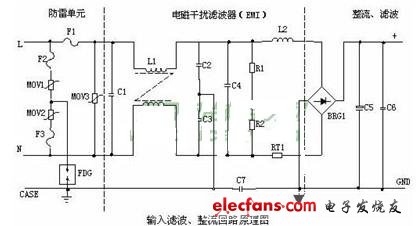 ?、?輸入濾波電路:C1、L1、C2、C3組成的雙π型濾波網(wǎng)絡(luò)主要是對輸入電源的電磁噪聲及雜波信號進行抑制,防止對電源干擾,同時也防止電源本身產(chǎn)生的高頻雜波對電網(wǎng)干擾。當(dāng)電源開啟瞬間,要對 C5充電,由于瞬間電流大,加RT1(熱敏電阻)就能有效的防止浪涌電流。因瞬時能量全消耗在RT1電阻上,一定時間后溫度升高后RT1阻值減小(RT1是負溫系數(shù)元件),這時它消耗的能量非常小,后級電路可正常工作。