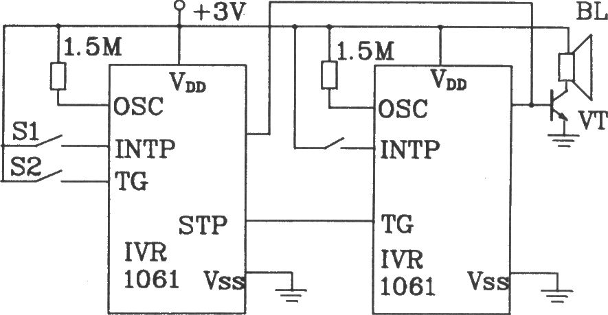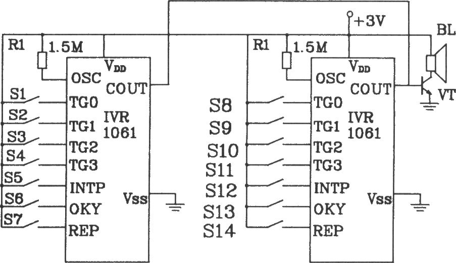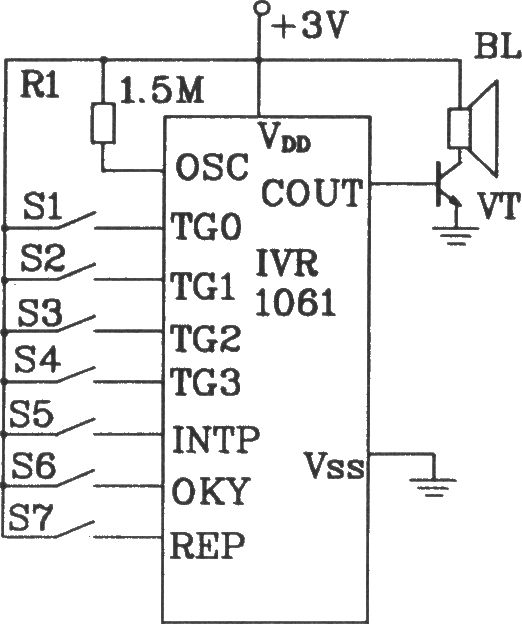 ①I(mǎi)VRl061為一次性可編程CMOS語(yǔ)音集成電路??删幊痰墓δ芎弯浫胝Z(yǔ)音的錄音帶由用戶提供,廠家使用專門(mén)設(shè)備編程錄入。