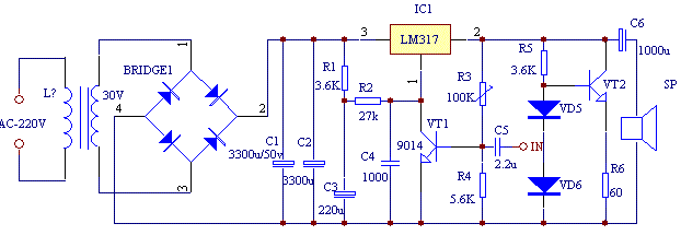 三端穩(wěn)壓IC選取LM317,三極管VT1選取9014。VT2選用8050型,二極管VD5、VD6選用2CP20,變壓器的功率應(yīng)大于50.