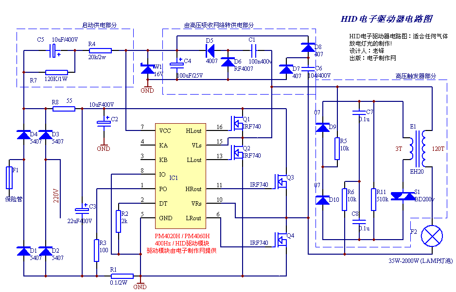 采用PM4020H設(shè)計的(HID)或高壓鈉燈電子鎮(zhèn)流器: