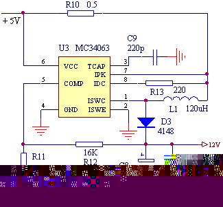關(guān)鍵字:MC34063 5V-12V大電流升壓電路