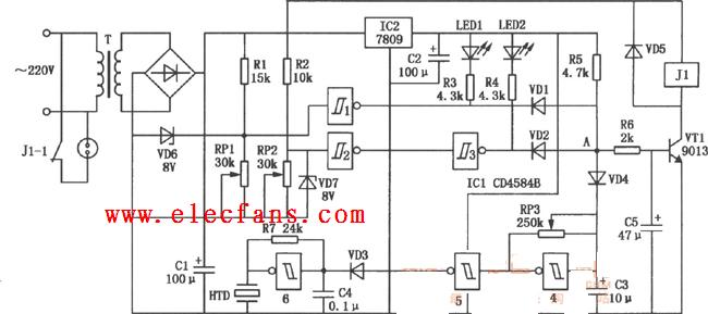 如圖所示是一種過壓保護電路。當(dāng)外電壓E未超過設(shè)定的電壓Vs時,負阻發(fā)光二極管VD1截止,VT因無基極電流也截止,繼電器J