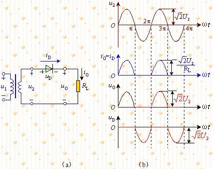 利用二極管的單向?qū)щ娦裕谧儔浩鞲边呺妷篣2為正的半個(gè)周期內(nèi),二極管正向偏置,處于導(dǎo)通狀態(tài),負(fù)載RL上得到半個(gè)周期的直流脈動(dòng)電壓和電流;而在U2為負(fù)的半個(gè)周期內(nèi),二極管反向偏置,處于關(guān)斷狀態(tài),電流基本上等于零。由于二極管的單向?qū)щ娮饔?,將變壓器副邊的交流電壓變換成為負(fù)載 兩端的單向脈動(dòng)電壓,達(dá)到整流目的,其波形如圖14-1-1(b)。因?yàn)檫@種電路只在交流電壓的半個(gè)周期內(nèi)才有電流流過(guò)負(fù)載,所以稱為單相半波整流電路。
