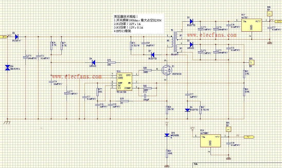 70 3842開(kāi)關(guān)電源電路圖,電路元件有:UC3844 TL431 7905 IRF830