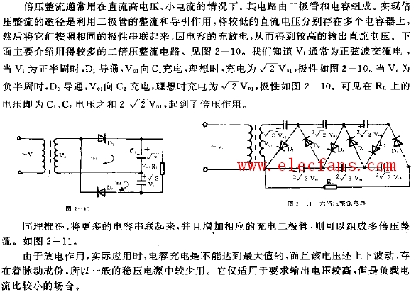 在一些需用高電壓、小電流的地方,常常使用倍壓整流電路。倍壓整流,可以把較低的交流電壓,用耐壓較高的整流二極管和電容器,“整”出一個較高的直流電壓。倍壓整流電路一般按輸出電壓是輸入電壓的多少倍,分為二倍壓、三倍壓與多倍壓整流電路。