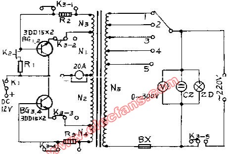可以采用現(xiàn)有的雙12V-200W的電源變壓器,只是逆變效