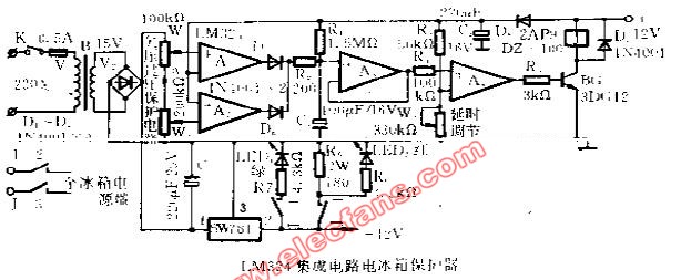 以下就是電冰箱溫度告知電路的構(gòu)成及原理的解釋和說明: 如圖所示為電冰箱溫度告知電路。該電路由降壓整流電路、溫度檢測元件Rt、集成運算放大器LM324、電平顯示集成電路SL322等組