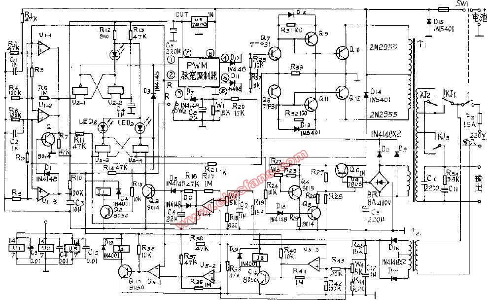 這款全自動交流穩(wěn)壓器電路能大大延長昂貴電器的使用壽命,當輸入電壓為170V~270V時,穩(wěn)定輸出電壓范圍為200V~240V,額定功率為2.5kW(只要對變壓器作微小修改,就可以增加或減小額定的功率)。