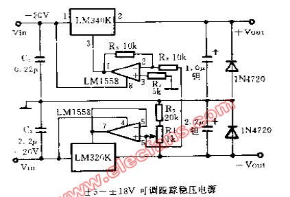 正負(fù)5V到18V可調(diào)跟蹤穩(wěn)壓電源電路