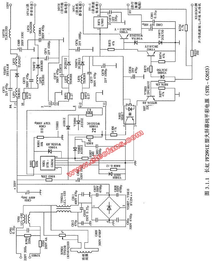 長(zhǎng)虹PF2991E型大屏幕純平彩電電源電路圖(STR-G56