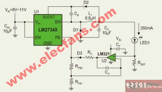LM2734是1A降壓型穩(wěn)壓器?;?b style="color: red">LM2734的恒流驅(qū)動電路(圖3)利用LM321運算放大器獲取