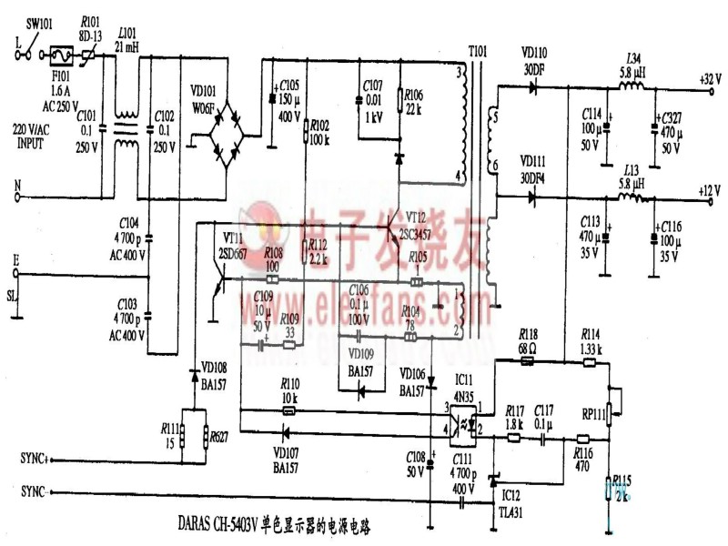 DARAS CH-5403V型單色顯示器的電源電路圖