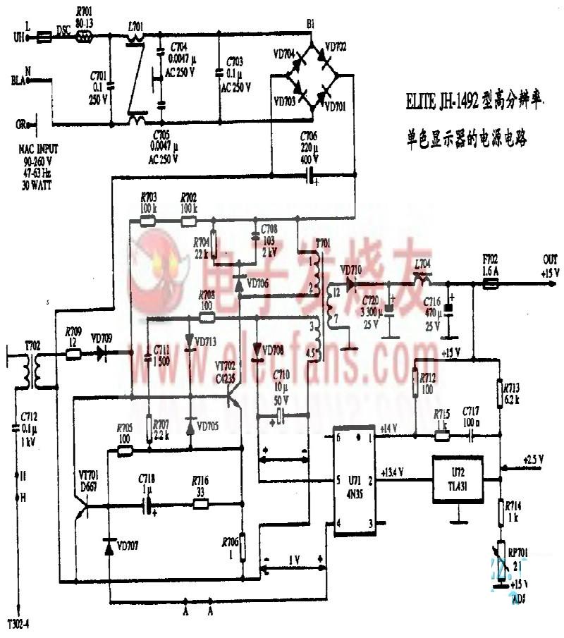 43 KEY ECH-14型單色顯示器的電源電路圖