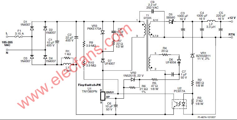 使用TNY380PN的通用電壓輸出、20W連續(xù)輸入功率、45