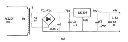 電源電路采用LM7805集成穩(wěn)壓器作為穩(wěn)壓器件,用典型