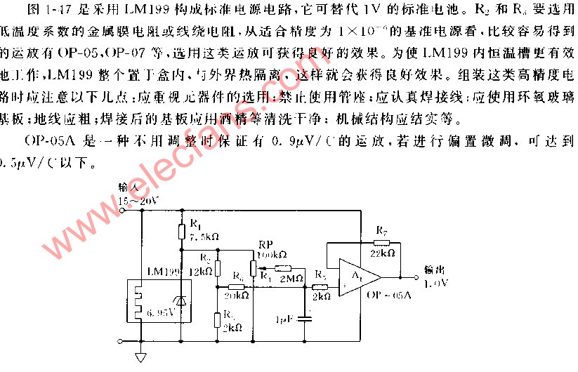 本圖是由LM134等構(gòu)成的電子溫度計電路。電路中,LMl34的輸出電壓或電流與熱力學溫度成比例,可直接在100μA表頭上讀出被測量的溫度,其測量溫度范圍為-55一150℃。電源電壓在lV以下也能T作