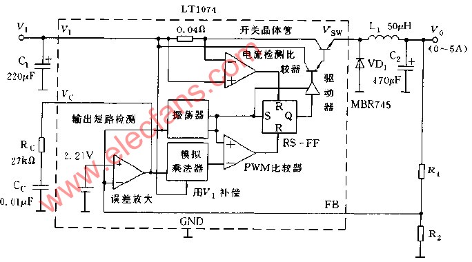 2 降壓開關(guān)穩(wěn)壓器LT1074的功能是把直流經(jīng)降壓、整流、平滑的非穩(wěn)定直流變?yōu)榉€(wěn)定的直流。其輸出電流約為5A,過負(fù)載時(shí)限流電路動(dòng)作,輸出電壓可由外接電阻進(jìn)行調(diào)整。