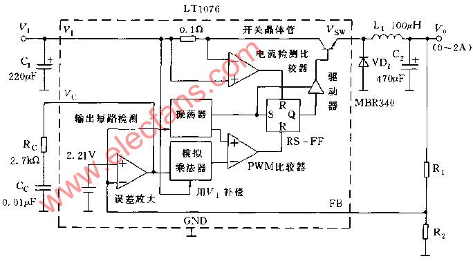 LT1076 額定在 2A) 單片式雙極性開關(guān)穩(wěn)壓器,其只需少量的外部元件即可正常操作。功率開關(guān)、所有的振蕩器和控制
