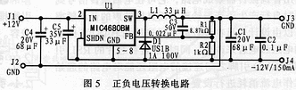 利用MIC4680還可以進行正負電壓的轉(zhuǎn)換。圖5所示是用MIC4680組成的正負電壓轉(zhuǎn)換電路,利用該電路可以將+12V的輸入電壓轉(zhuǎn)換成-12V的輸出電壓,并可得到150mA的輸出電流。