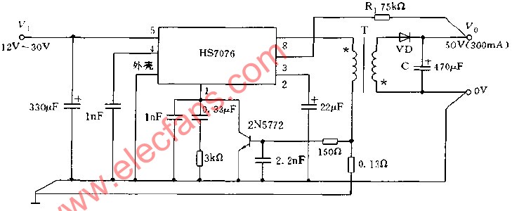 采用HS7076構(gòu)成的變壓器耦合DC DC變換器電路