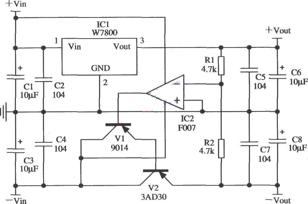 如圖所示是用7800正集成穩(wěn)壓器和F007運(yùn)算放大器組成的跟蹤式穩(wěn)壓電源的應(yīng)用電路。在有些使用正、負(fù)電源的場(chǎng)合,需用負(fù)電源跟蹤正電源的變化。圖中用W7800 做正電源,用運(yùn)算放大器和功率管組成可跟蹤的負(fù)電源。圖中用兩只完全相同(精度要高)的4.7 kΩ電阻,將F007的輸入端電位控制在零電平,而用F007的輸出端去控制負(fù)電源回路中的調(diào)整管,以保持負(fù)輸出對(duì)正輸出的跟蹤。F007運(yùn)放的電源采用正、負(fù)的輸入電壓源。