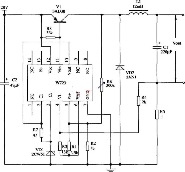 圖中所示是用W723多端可調(diào)式集成穩(wěn)壓器組成的開關(guān)穩(wěn)壓器線路,額定輸出電流0.5A,實(shí)際