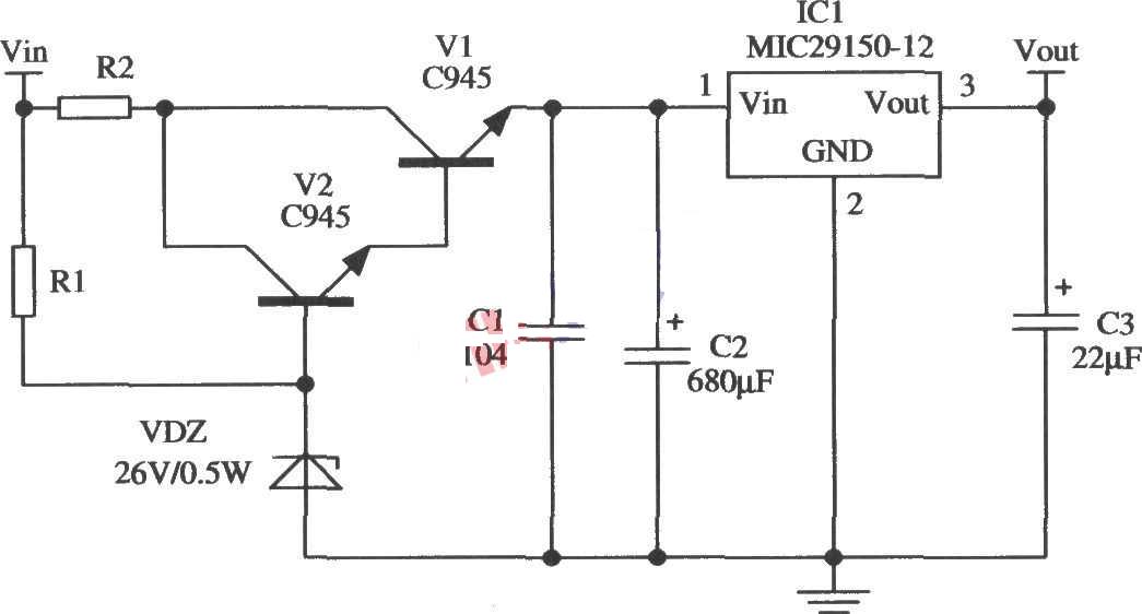 MIC29150組成的有寬輸入電壓范圍的穩(wěn)壓器電路