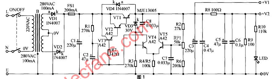 JK50-1A型50W晶體管擴(kuò)音機(jī)穩(wěn)壓電源電路原理圖