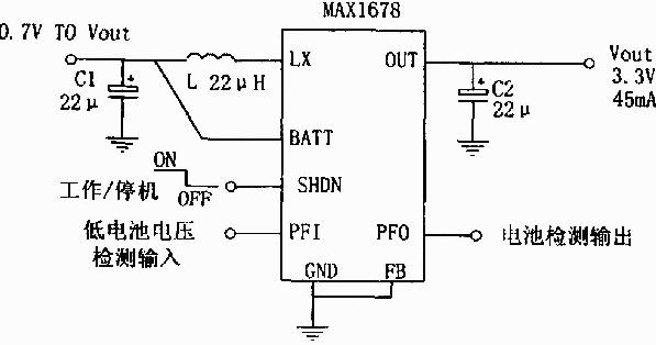 如圖所示為適用于尋呼機的高效率單電池升壓電源。它是由MAX1678和3只外圍元件構(gòu)成。MAX1678是一種專為l至2節(jié)電池供電的低功耗應(yīng)用而設(shè)計的。它采用超小型8引腳,μMAX封裝。不需外接MOSFET和肖特基二極管,降低了系統(tǒng)的成本和體積成本。芯片內(nèi)部具有電池欠壓檢測電路、噪聲抑制電路。MAX1678采用專有的恒峰電流控制原理,使其不僅保持了傳統(tǒng)PWM轉(zhuǎn)換器的低靜態(tài)電流,而且具有高滿負(fù)載效率及低輸出電壓紋波。用它組成的升壓轉(zhuǎn)換電源,可工作于0.7V的輸入電壓,輸出電壓預(yù)設(shè)在3.3V。其特點是:效率在90%以上;輸入電壓為0.85V即可啟動;45mA的輸出電流(1.2V升到3.3V);靜態(tài)電流37μA,停機電流2μA;體積小、外部元件少、結(jié)構(gòu)簡單。