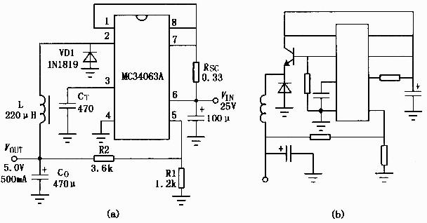 MC34063是一塊常用的DC—DC降壓變換器。輸入電壓為+8-+16V。輸出電壓固定為+5V。最大輸出電流為0.6A。附圖是用它組成的降壓變換器電路。